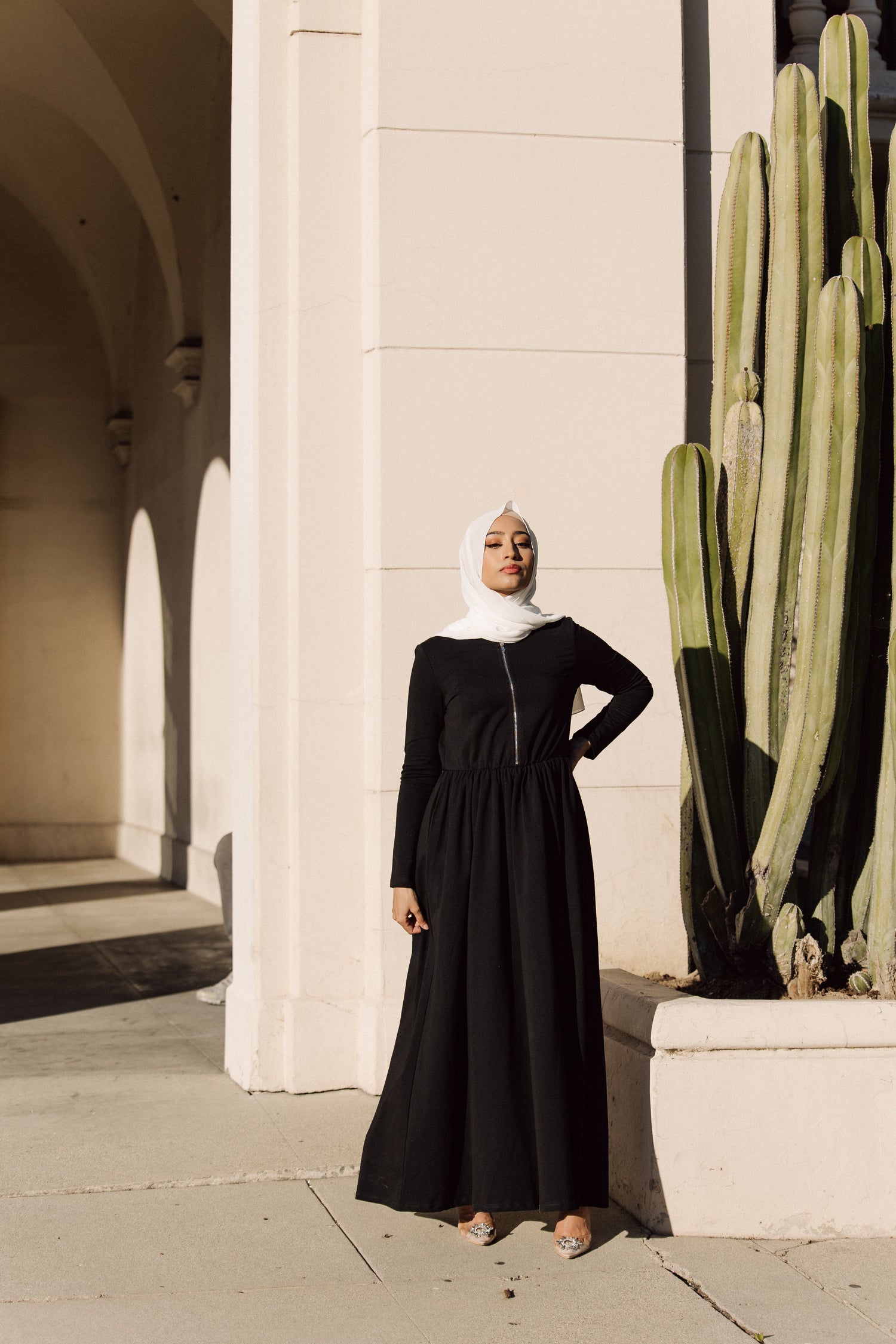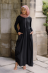 Niswa keeps you classy in our comfortable and casual zippered jersey dress. A stunning loose a-line silhouette and flowing hem offer a classy spin to an everyday modest fashion staple. The Aminah has pleated waistline, half-zip bodice, round collar, and full sleeves.  Available in 3 shades.