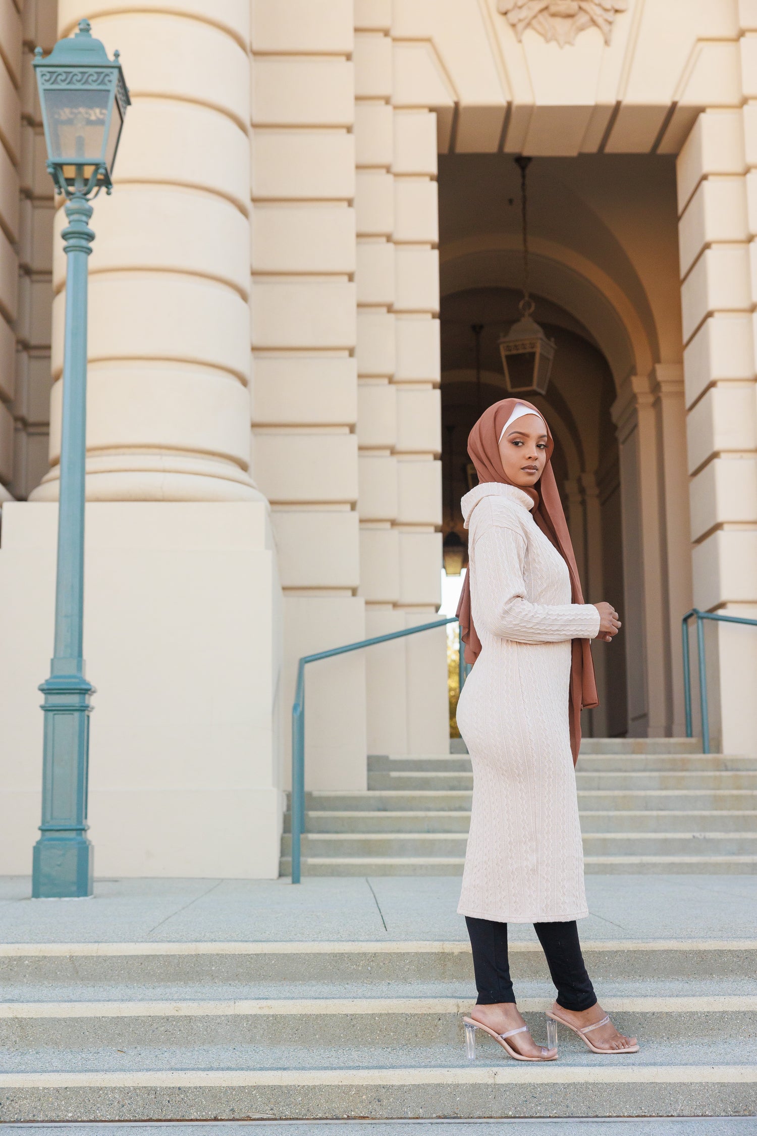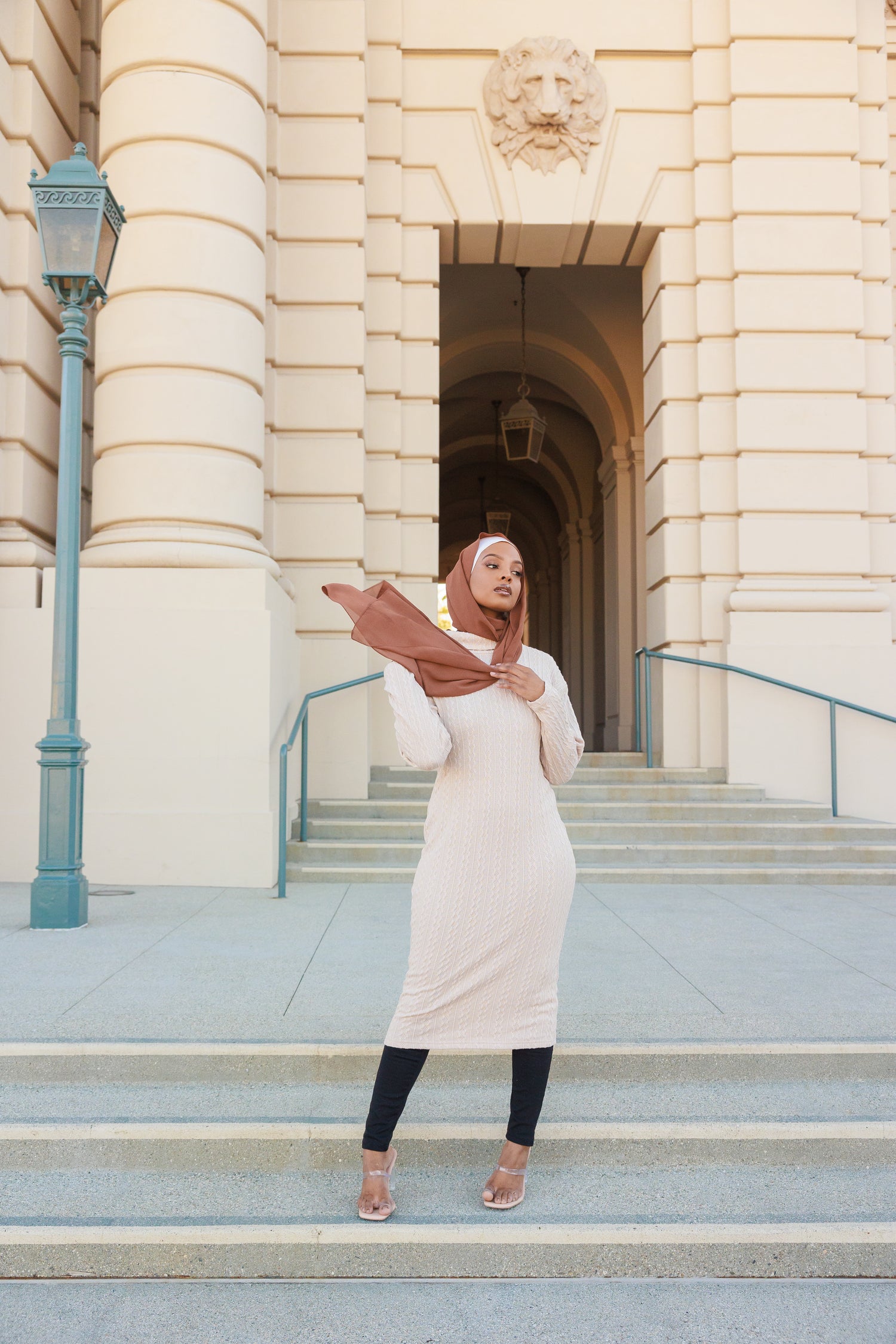 Niswa’s one-of-a-kind Cowl Neck Long Sleeve Sweater Dress will keep you cozy and warm when the temps drop.  This super soft and lightweight knit offers a cozy fit with a cowl neck and classic  long sleeves. The shift bodice falls effortlessly to a rounded hem. Elevate your Modest fashion Hijabi wardrobe with this classic essential.