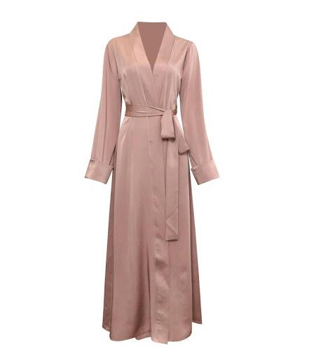 This sensational full-length wrap abaya exudes elegance. Made of the softest satin and rayon blend, this wrap abaya feels like a breeze and looks exquisite. With an elegant notch lapel collar and cuffed sleeves, this formal abaya is perfect for any occasion.The fabric moves effortlessly with your every move! The self-belt cinches waist elegantly and creates the most beautiful silhouette. Available in three summer shades.